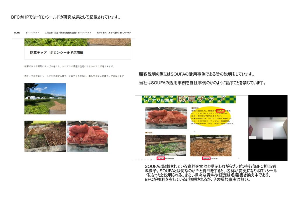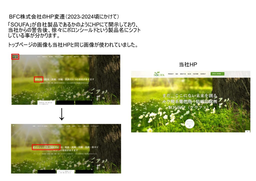 Nhiều dữ liệu khác nhau, bao gồm dữ liệu thử nghiệm chống mối của SOUFA và số chứng nhận chống mối (A-5465, A-5470) được liệt kê trên trang web của BFC Corporation và trình bày trong các tài liệu mà công ty sử dụng cho mục đích bán hàng và các mục đích khác, đều là dữ liệu hoặc số chứng nhận của công ty chúng tôi. Công ty cũng tiết lộ các dự án xây dựng và đào tạo đã sử dụng SOUFA, tạo ấn tượng rằng các sản phẩm của BFC đã được sử dụng. Công ty TNHH BFC sản xuất và bán những sản phẩm này với nhãn mác được cho là hiệu suất và thành tích của chính sản phẩm của công ty.